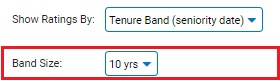 For example, choosing to use a tenure band size of 10 yrs, the results will show the rating distribution totals for all employees who have been employed for 0-10, 11-20, 21-30, etc. years.
