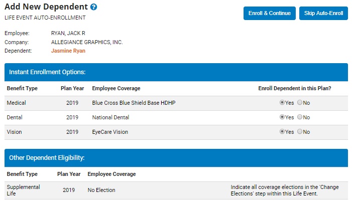 To bypass this auto-enroll option and make all coverage elections for this new dependent in the standard enrollment screens, choose the Skip Auto-EnrollSkip Auto-Enroll button.
