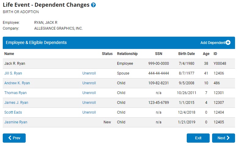 Note: You may not delete dependents as part of a birth/adoption Life Event. However, if your dependent will be obtaining coverage elsewhere, you may unenroll them. The UnenrollUnenroll link will remove the dependent from all existing coverage.