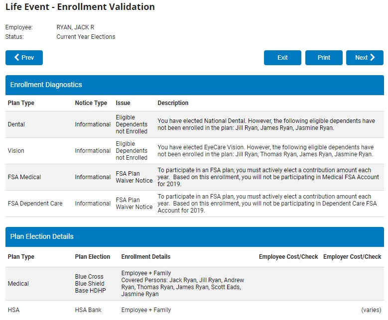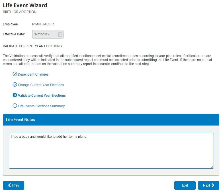 Note: The Validation process will verify that all modified elections meet certain enrollment rules according to your plan rules. If critical errors are encountered, they will be indicated in this report. You must correct these errors before submitting the Life Event.