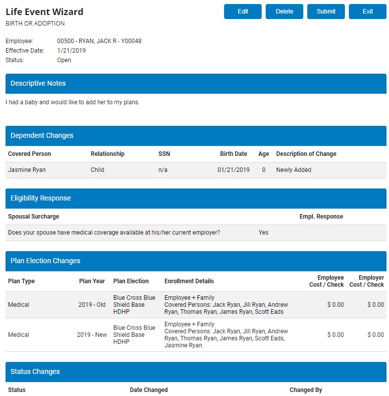 The Life Event SummaryLife Event Summary page displays all changes to your benefits.