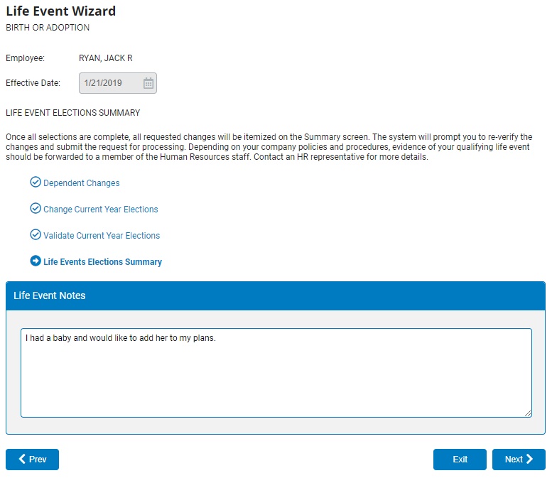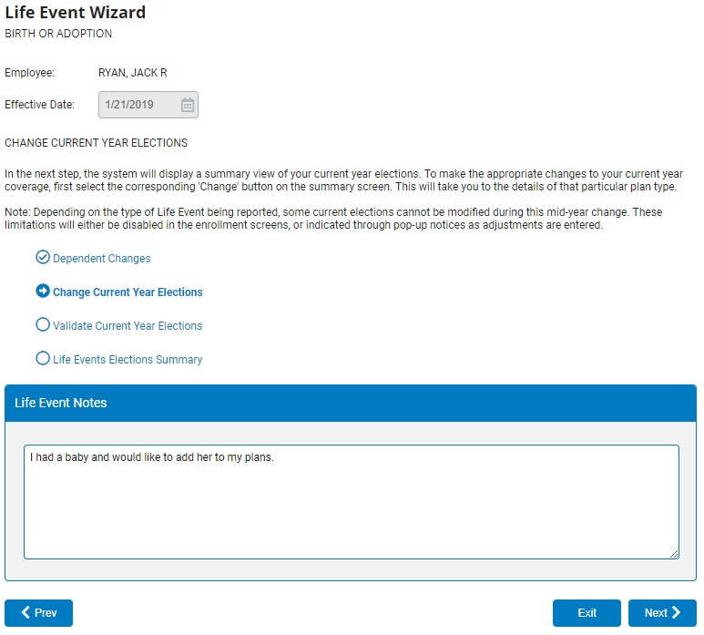 If you or your spouse has given birth to a child or completed the legal adoption of a child within the last 31 days, child and/or spouse may be added to your covered plans. You may also elect previously declined coverage for you and your eligible dependents. A Wizard will step you through the process necessary to complete the benefits change request. If you need to leave the process prior to completion, use the Exit button to save your changes and resume later.