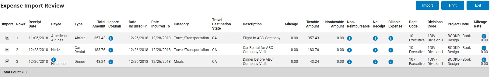 7. Once all desired expenses have been checked, click the ImportImport button. If changes need to be made, click the ExitExit button and make the desired adjustments to the file or template.