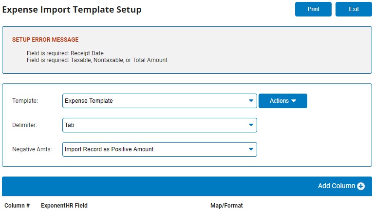 The Expense Import Template SetupExpense Import Template Setup page displays.