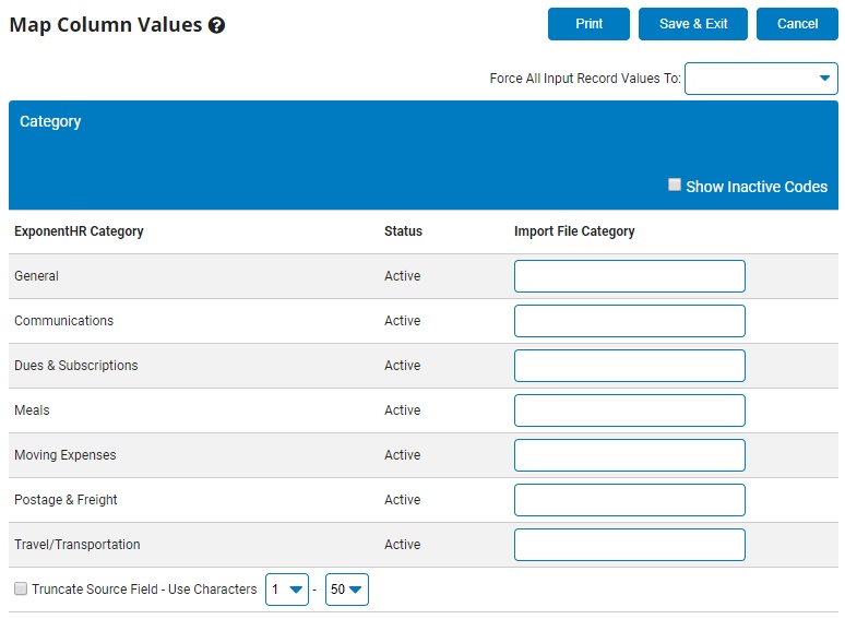 2. For each ExponentHR code, type the matching code from the import file. (For example, for the ExponentHR Location Code Dallas, your source file might have it as DFW.)