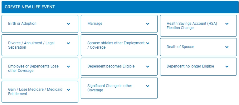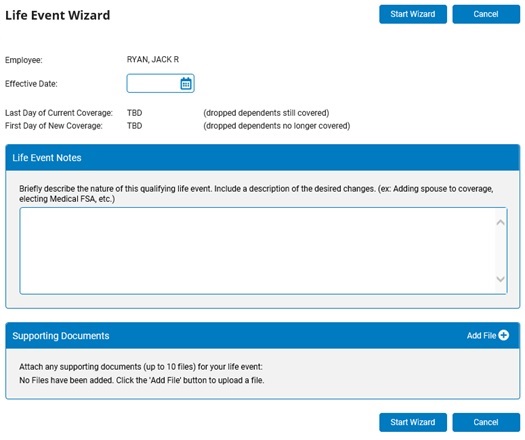 Life Events allow you to make changes to your personal information and changes to your benefits information outside of the standard enrollment period. After selecting a life event, a Wizard will step you through the process necessary to complete the benefits change request. If you need to leave the process prior to completion, use the Exit button to save your changes and resume later.