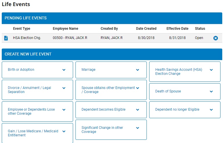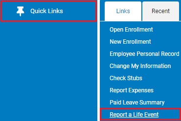 You can also access the Life Events page from the Menu by clicking Quick Links > Report a Life EventQuick Links > Report a Life Event.