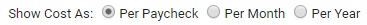 2. To view employee cost per paycheck, per month or per year, click a radio button in the Show Cost AsShow Cost As section of the Current Benefit Enrollment Status table.
