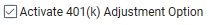 To include retirement plan deductions (and any associated employer match contributions), select the Activate 401(k) Adjustment OptionActivate 401(k) Adjustment Option check box.