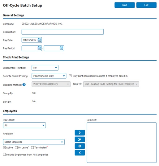 All of the pay types listed in the Include in Batch box will be displayed in the off-cycle batch.
