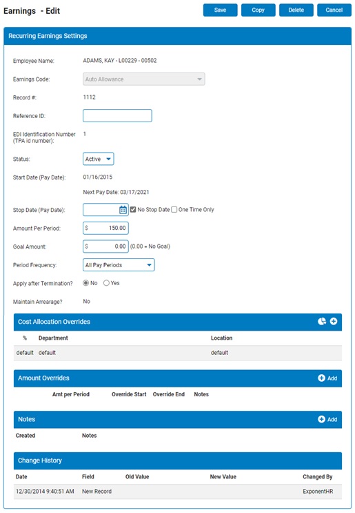 Note: The copy feature within the setup of each Recurring Item record, which is available for both Group records and Single Employee records, duplicates the basic setup of an existing recurring item as a template that can be used to create a similar recurring item, or the same item for another employee. (The Copy function can also be used to quickly set up a new Goal-Based recurring item that is similar to a completed item – such as a goal-based deduction that must be re-started each calendar year.)