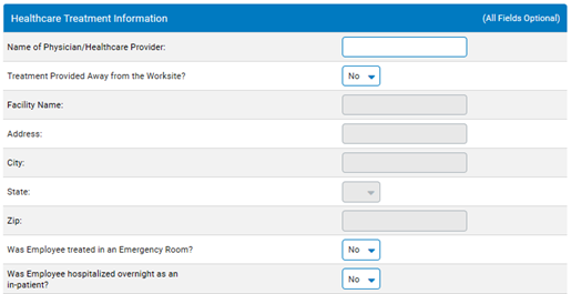 The fields in this section are optional, but may be used to provide helpful information for recordkeeping and reporting regarding the treatment the employee received.