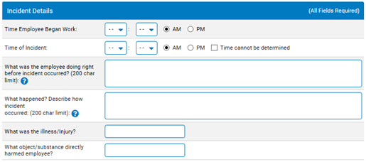 Note: The employee's work demographics are pre-populated in the Employee Information section per the values on the employee's personal record. However, these fields may be adjusted if necessary per the employee's assignment and activities at the time of the incident.