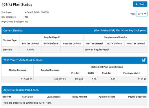 The 401(k) Plan Status401(k) Plan Status page displays.