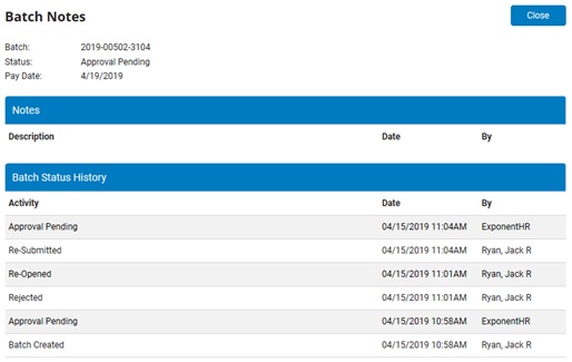 The Batch NotesBatch Notes page displays, with a Batch Status History area that shows all of the statuses of the batch including who initiated the status change and the date and time of the change.