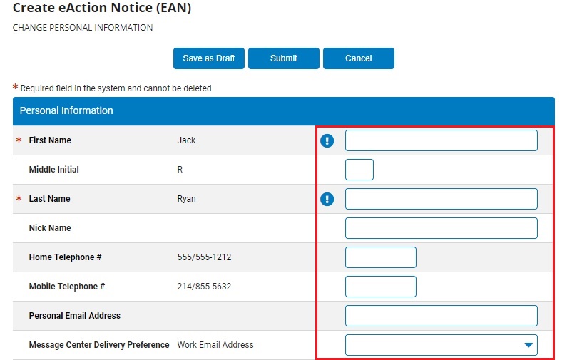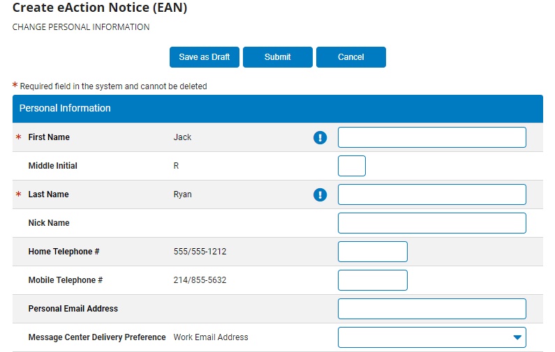 The Create eAction Notice (EAN)/Change Personal InformationCreate eAction Notice (EAN)/Change Personal Information page displays.