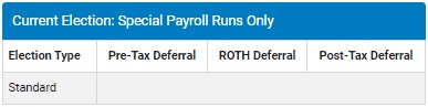 Note: Depending on your company's retirement plan offering, the sections/fields may vary slightly than the 401(k) Plan Status page image shown above. If the Special Payroll Runs OnlySpecial Payroll Runs Only section is made available by your employer, this provides users the option to designate a third/separate set of deferral elections that are to be solely used for specialized payrolls (such as profit sharing or an annual bonus payout).