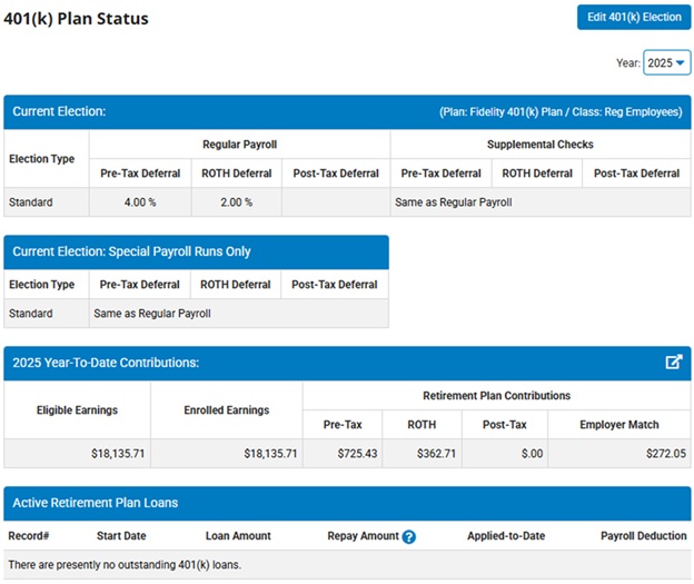 The 401(k) Plan Status401(k) Plan Status (403(b) Plan Status) page displays, showing current elections, year-to-date contributions, and any active loans.