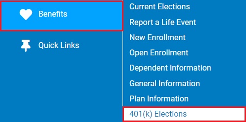1. On the Menu, click Benefits > 401(k) ElectionsBenefits > 401(k) Elections (403(b) Elections).