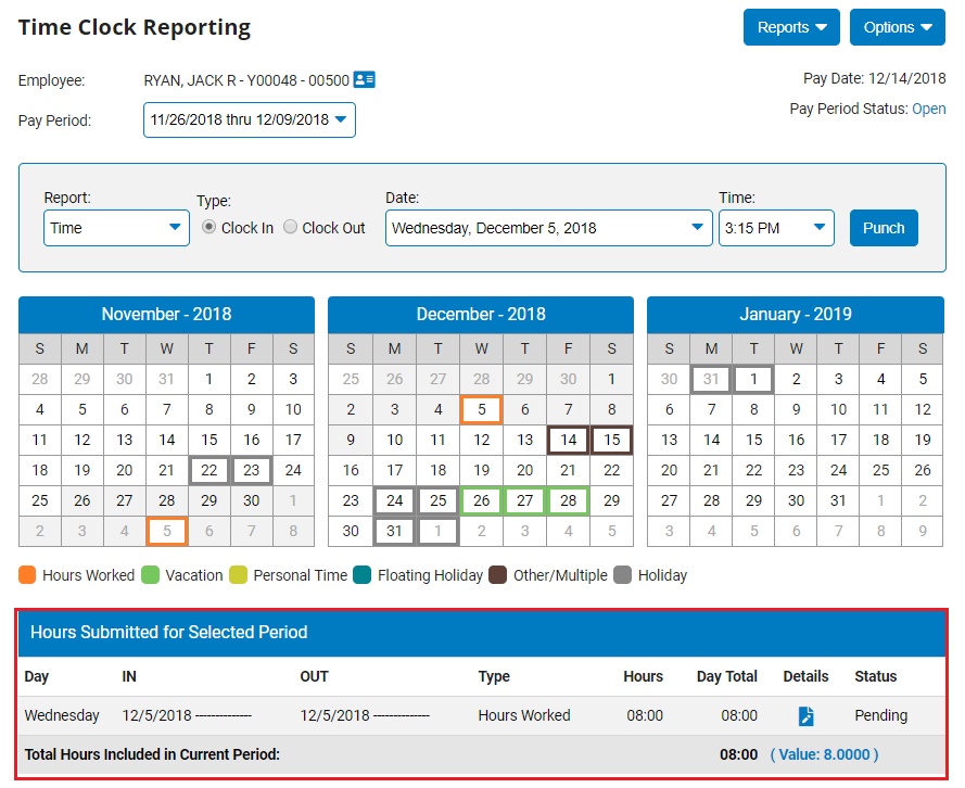 Note: You can also access the Time Clock Reporting page from the Menu by clicking Quick Links > Report TimeQuick Links > Report Time.