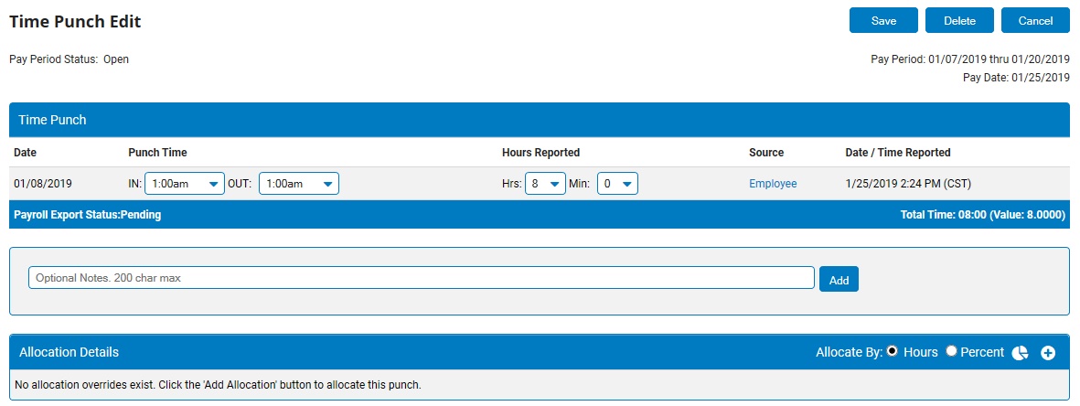 The Time Punch EditTime Punch Edit page displays.