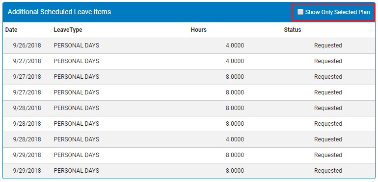 6. To disable view of Additional Schedule Leave ItemsAdditional Schedule Leave Items for other plans, click the Show Only Selected Plan check box to clear it.