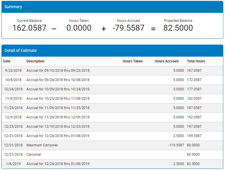 The summary and detail of estimatesummary and detail of estimate displays. The summary takes the current balance, subtracts any future hours scheduled to be taken, and adds the accrued hours.